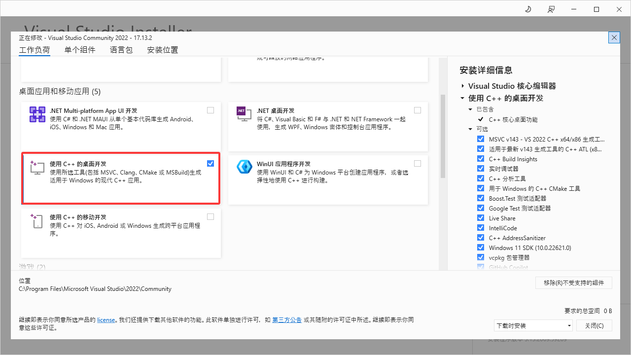 勾选“使用C++的桌面开发”
