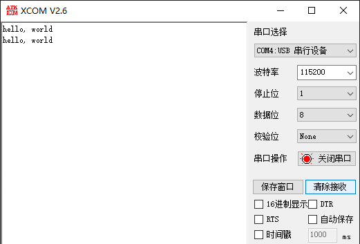程序中设置启用的是默认串口,即pico的1、2脚,波特率为115200,连接串口就会看到每隔一秒钟重复发送的hello, world。